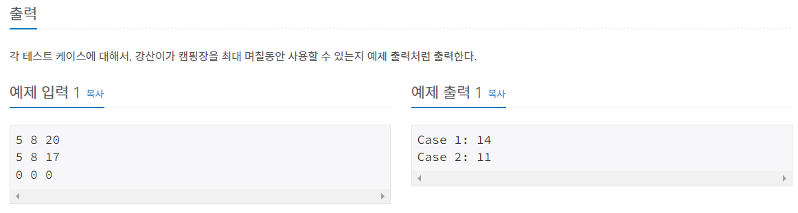 이때 (V/P)*L + (V%P>L ? L:V%P) 코드에서 ?를 사용했는데 이는 앞의 조건을 만족하면 A:B 부분에서 A를 만족하지 않는다면 B를 출력하는 연산자다.