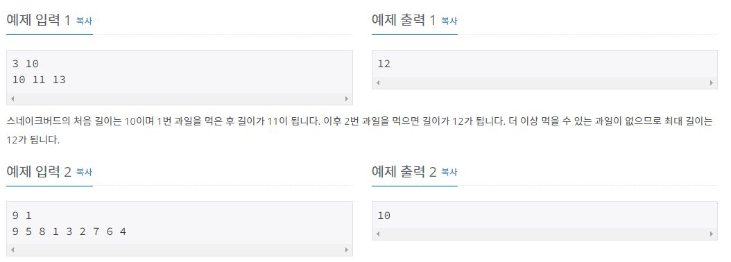 배열을 입력받아서 sort로 정렬해주고 스네이크버드가 자신보다 짧거나 작은 높이에 있는 먹이를 먹으면 무조건 1씩 성장하기 때문에 순차적으로 올라가면서 일일이 더해줘야 한다. 다른 특이점은 없었음