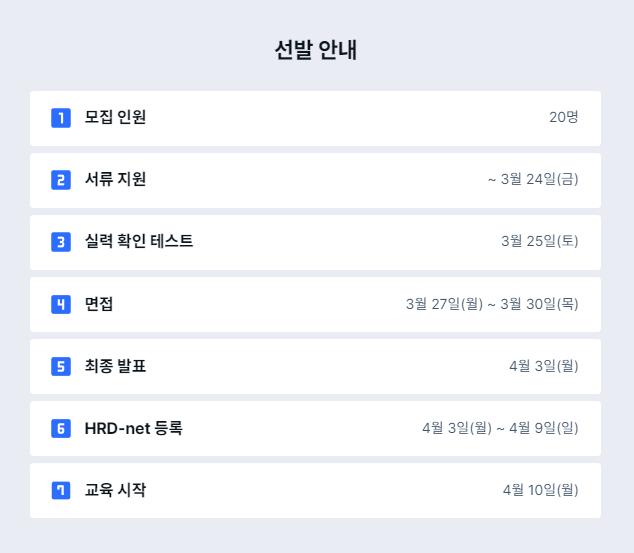 선발 과정은 위와 같이 진행이 되는데 처음에는 간단하게 지원서를 작성했다가 상세 커리큘럼을 보니 너무 하고 싶은 생각이 들어서 꽉꽉 채워 내 열의를 느끼실 수 있도록 채워 작성했다.